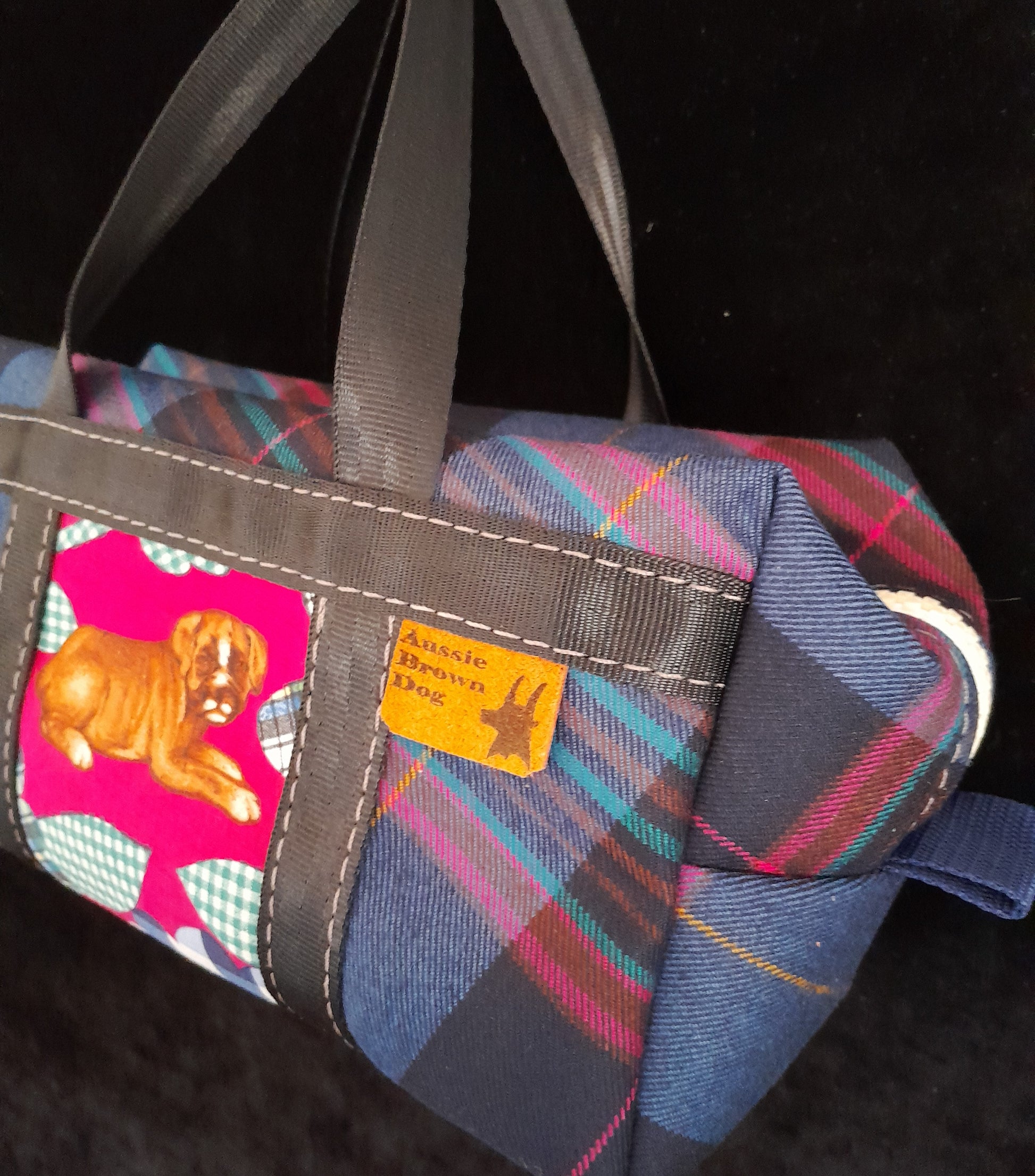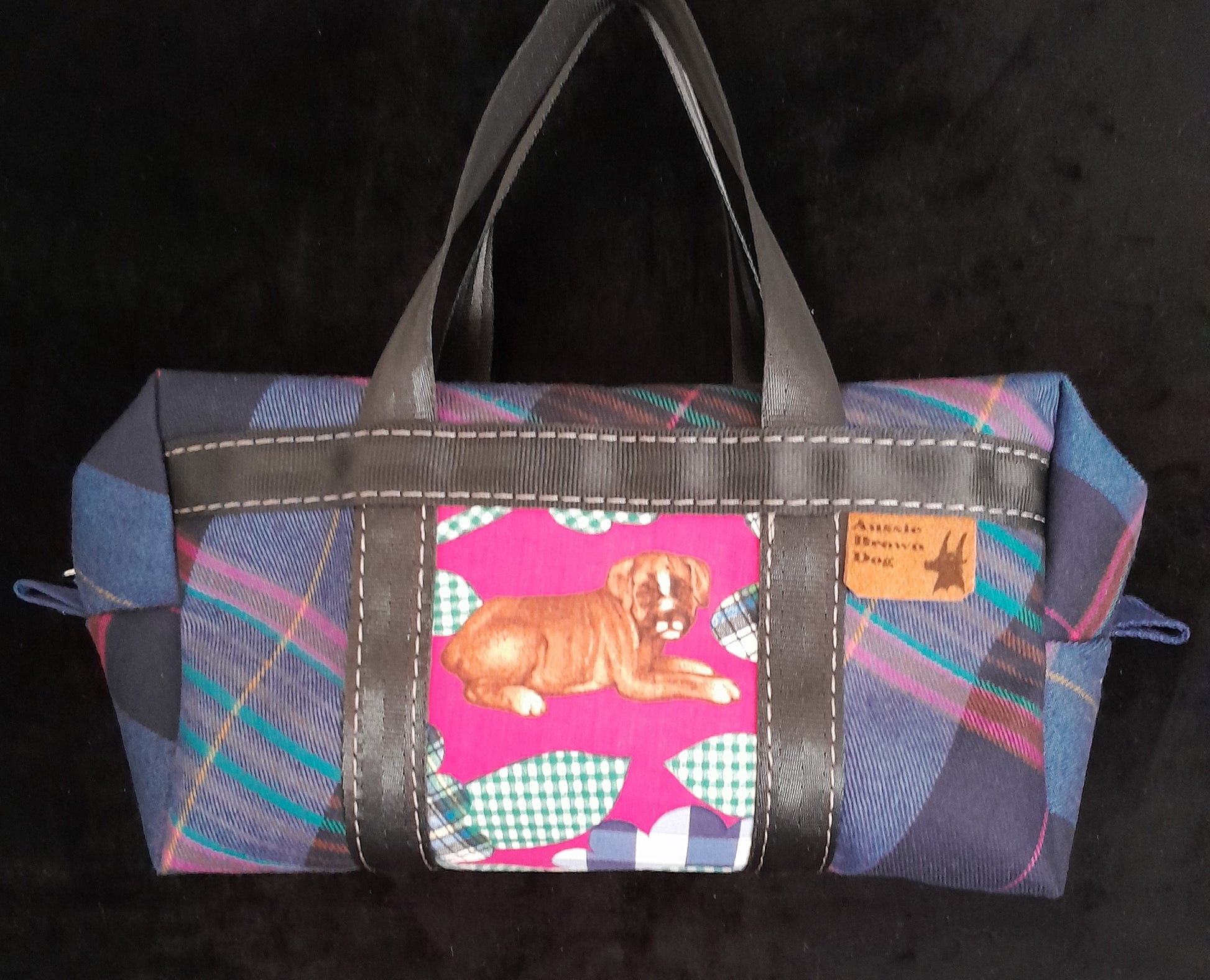 'Tartan Puppy' Small Bag with cotton Puppy feature panel on Vintage tartan. Colours of pinks & blues.
